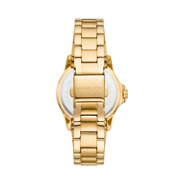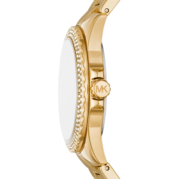 • Mini watch • Stainless steel • Gold-tone hardware • Pavé top ring • Mother-of-pearl dial • Mini-sized • 33mm case • Quartz/3-hand movement • Clasp fastening • Water resistant up to 5 ATM • 2-year warranty • Imported